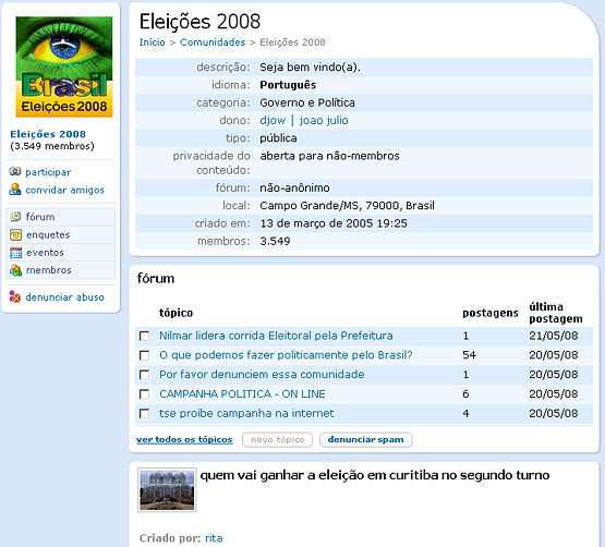 Os levantamentos feitos no início de maio indicaram mais de 180 comunidades no Orkut sobre os principais candidatos a prefeito de São Paulo. Número bastante superior ao de julho de 2006, quando havia 46 comunidades sobre os principais candidatos. Uma busca inicial pelo YouTube, utilizando a tag “eleições 2008” também já resulta em diversos vídeos feitos pelos eleitores com o objetivo de alertar a população para a corrupção e a importância do voto.