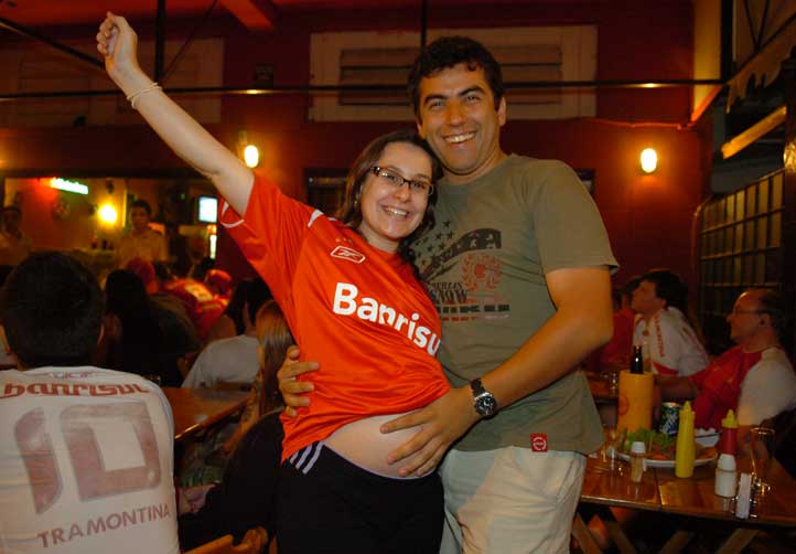Laura estava no bar acompanhada do casal de amigos colorados Thiago Gomes e Amanda Fialho, que esperam a pequena Cecília — que, garantem, torcerá