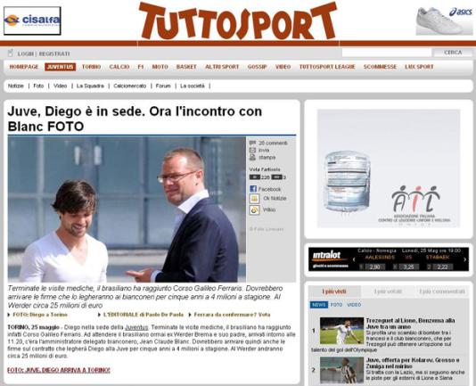 O meia Diego está muito perto de ser anunciado como reforço do Juventus. O ex-santista chegou nesta segunda-feira a Turim, visitou a sede do clube e passou por exames médicos. Segundo a imprensa, o time italiano pagará € 25 milhões (R$ 71 milhões) ao Werder Bremen.