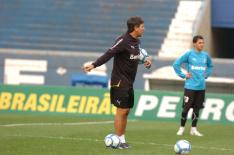 Renato mantém a tradição de não revelar seus times. Nos treinos, ele testa várias opções. Nas entrevistas, despista. Porém, na tarde desta terça, ele deu mais atenção ao esquema 4-4-2. Mesmo quando orientou a equipe com três zagueiros, usou dois atacantes, no 3-5-2. Ao que tudo indica, Jonas e Borges vão atuar juntos contra o Santos, a partir das 22h desta quarta, no Olímpico, pela 16ª rodada do Brasileirão. Além disso, o treinador treinou a maior parte do tempo com Vilson, novo reforço, na zaga.