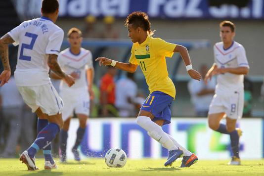 Foi um primeiro de muito toque de bola de um lado e tentativas frustradas de bolas enfiadas de outro. Engana-se quem pode pensar que o ritmo ditado por troca de passes foi do Brasil. Pois é. O 4-3-3 de Mano Menezes, com Robinho e Neymar flutuando no ataque, com Fred servindo como referência na área foi anulado pela boa defesa da seleção vice-campeã do mundo.