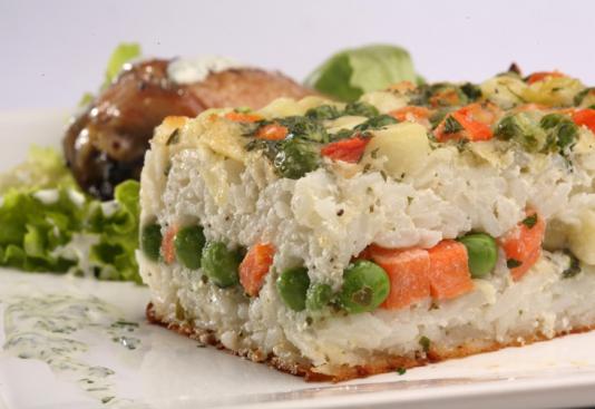 creme de ervas. Cubra com a outra metade do arroz e disponha o creme de ervas restante. Leve ao forno pré-aquecido em temperatura média (180ºC)
