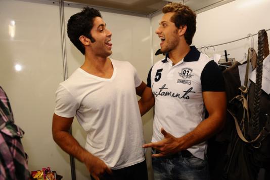 No intervalo entre o desfile da Love by Act, realizado das 20h às 20h20min, e o da Colcci, que começou às 22h, os ex-BBBs Eliéser e Cadu se encontraram nos camarins do Donna Fashion Iguatemi e bateram um papo em frente aos fotógrafos.