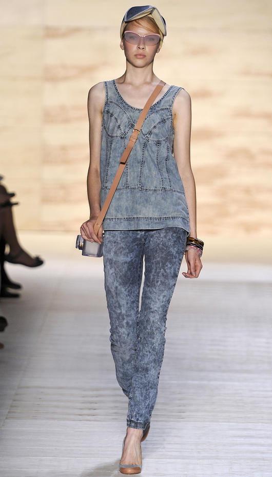 Os jeans aparecem das mais variadas formas em diferentes peças, como calças, vestidos, saias, bodys, macaquinhos, jaquetas e camisas — muitas vezes, com influência da lingerie. Peças em crochê de fio de seda engomado devem fechar o desfile.