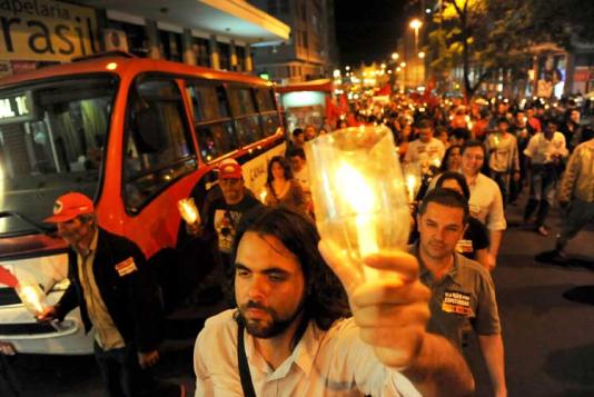 Com bandeiras de sindicatos, faixas contra a governadora e tambores, o grupo gritava "Fora Yeda". Às 20h20min, era possível visualizar a marcha de luzes que se dirigia à Praça da Matriz. Quando chegaram ao Piratini, a presidente do Cpers-Sindicato, Rejane de Oliveira, pediu para que cada manifestante colocasse a sua vela no chão. Ao final da composição, podia-se ler no escuro a palavra "impeachment" iluminada.