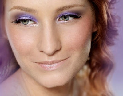 "Nas pálpebras móveis e no canto interno de Daniele Mancz, coloquei sombra lilás. Na dobra dos olhos e canto externo, um lilás quase marrom. Para valorizar o olhar, dei uma leve pitadinha com sombra pérola no canto interno inferior dos olhos. É um truque bom para quem tem olho pequeno. O blush pêssego rosado nas maçãs valoriza o tom de pele."