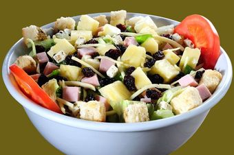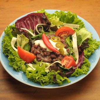 O 10 Pastéis serve saladas feitas com Frango Grelhado, Carne Grelhada, Peito de Peru ou Empanado de Frango.