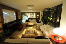 Depois de descer a rampa revestida com tiras de couro e observar as imagens de LosAngeles em preto e branco — feitas com exclusividade pelo fotógrafo Ricardo Navarro —, o visitante depara com um jardim tropical no espaço Cidade Cinema. Na proposta da engenheira civil e decoradora Rosane Dulinski, com a colaboração da arquiteta Simone Garcia e da arquiteta paisagista Christine Loro, home cinema e paisagismo se integram para criar um ambiente aconchegante e descontraído em 100 metros quadrados.