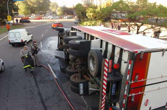 Um caminhão carregado de carne tombou na Avenida Sarmento Leite, esquina com a Avenida Engenheiro Luiz Englert, na região central de Porto Alegre, nesta sexta-feira. Cerca de 300 litros de óleo diesel vazaram de um dos tanques do veículo e atingiram um esgoto distante 3 metros do local do acidente. O motorista não se feriu e o homem que estava na carona teve escoriações leves e passa bem.