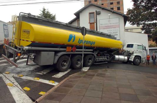Um caminhão de combustível da empresa Ipiranga não conseguiu vencer a curva na esquina das ruas Ferreira Viana e Guilherme Alves, no bairro Petrópolis, em Porto Alegre, e ficou parado no local, bloqueando o trânsito. A causa da parada do veículo foi a falta de tração devido à pista molhada e à lomba que há no trecho, conforme o encarregado de frota da companhia Marcelo Zanetti Arrieche.