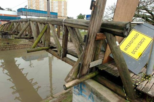parte central, o arroio impede a passagem de pessoas. De acordo com Adriano Stern, 41 anos, que também trabalha em frente a ponte, idosos e crianças são os maiores prejudicados com a interdição.