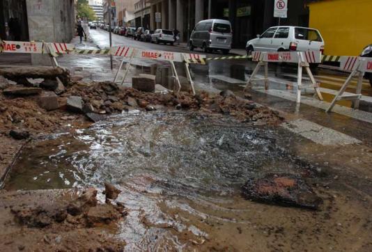Um grande volume de água vazava desde a manhã desta terça-feira de um buraco aberto pelo Departamento Municipal de Água e Esgotos (Dmae) no centro de Porto Alegre. O buraco foi cercado por cavaletes, impedia a passagem de pedestres pela calçada e restringia o trânsito na esquina da Rua Jerônimo Coelho com a Avenida Borges de Medeiros. Quem mais reclamava era o vendedor de cachorros-quentes José Carlos Souza, 63 anos.