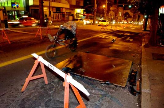 Por causa dos cavaletes, os coletivos estão sendo obrigados a transitar ao lado do buraco