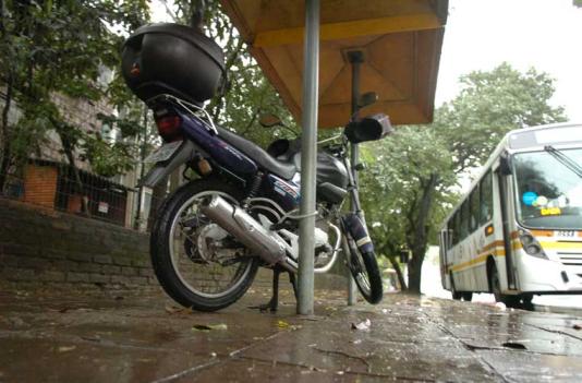 Os passageiros de ônibus sofrem em dias de chuva. Enquanto algumas paradas de ônibus não têm cobertura, uma foi utlizada como garagem para uma motocicleta na manhã deste domingo chuvoso em Porto Alegre.