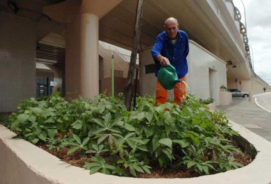 Debaixo da estrutura de concreto do viaduto Jayme Caetano Braun, no cruzamento das avenidas Carlos Gomes e Nilo Peçanha, em Porto Alegre, existe um pequeno oásis construído há um mês pelo auxiliar de serviços gerais Nestor Pereira, 63 anos. Funcionário da Cootravipa, cooperativa que presta serviços de limpeza à prefeitura da Capital, Pereira uniu o útil ao agradável ao plantar uma horta em um lugar improvável. Como sobram algumas horas depois do seu trabalho diário de limpeza nos banheiros do viaduto, ele se dedica às hortaliças em meio ao trânsito intenso da região.