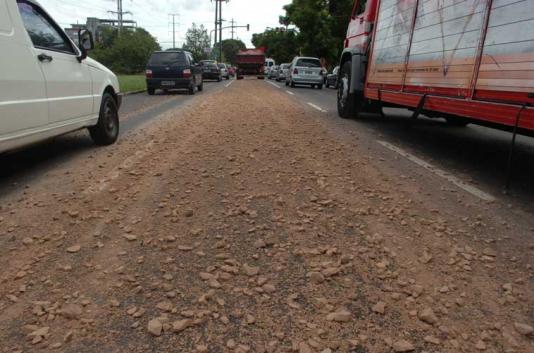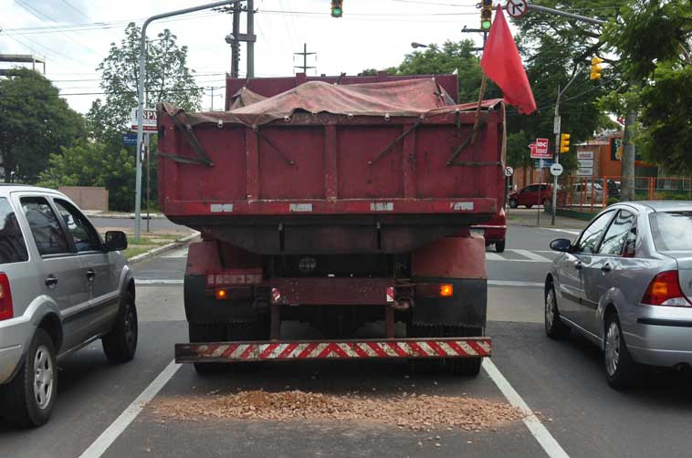 Um caminhão que seguia às 10h45min desta quarta-feira pela Avenida Ipiranga, em Porto Alegre, no sentido bairro-Centro, deixou cair pelo caminho parte da sua carga de pedras e areia usadas como base para asfaltamento. O material se espalhou por cerca de 40 metros. Agentes da Empresa Pública de Transporte e Circulação (EPTC) compareceram ao local e bloquearam uma das quatro faixas.