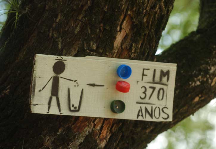 As placas continham informações sobre o tempo que leva para que materiais como o plástico se decomponham na natureza, e havia garrafas ou tampinhas coladas. Aguiar achou interessantes as mensagens e as manteve no local.