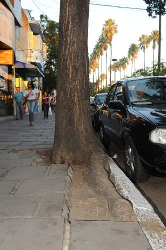 As calçadas irregulares no bairro Bom Fim atrapalham a vida de quem circula a pé pela região. Um exemplo disso está situado na Avenida Oswaldo Aranha, próximo à esquina com a Rua Santo Antônio. As raízes de uma árvore romperam o calçamento entre os números 778 e 784, que está elevado em relação ao restante da calçada.