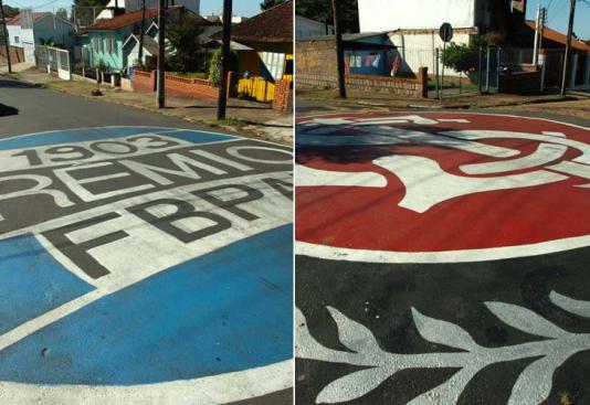 No cruzamento da Louvre com a Cruz e Souza, foi pintado o símbolo colorado, e um pouco adiante, no cruzamento com a Antônio Álvares Pereira Coruja, está estampado o do Grêmio. Apesar da rivalidade, vermelhos e azuis garantem que convivem em clima de harmonia e respeitam o brasão alheio.