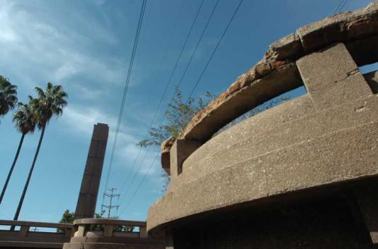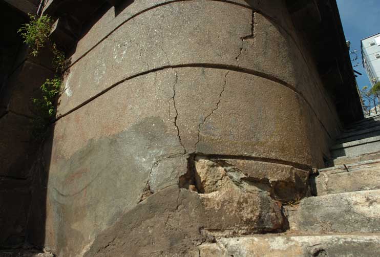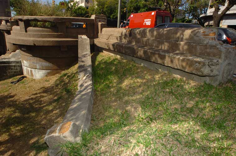 A ponte da Avenida João Pessoa sobre o Arroio Dilúvio, próximo ao Hospital Ernesto Dornelles, no bairro Santana, em Porto Alegre, está despedaçada, especialmente no setor onde fica a escadaria. As partes afetadas estão com os tijolos à vista. Um longo destroço de pedra, que poderia ser um pilar, um degrau ou um pedaço do muro que separa a escadaria da Avenida Ipiranga, está jogado sobre o gramado à beira do Dilúvio.