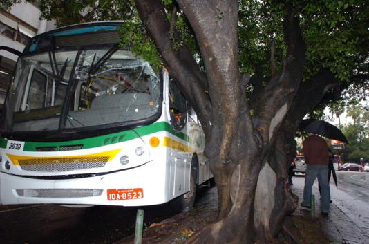 Um ônibus bateu em uma árvore às 9h10min desta quinta-feira na Avenida Senador Salgado Filho, no centro de Porto Alegre. Três passageiros ficaram levemente feridos. O acidente com o veículo, da empresa Unibus, linha Alameda, ocorreu na altura do número 327, próximo à esquina com a Rua Doutor Flores.