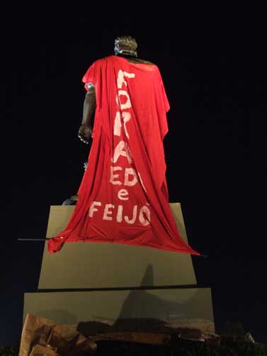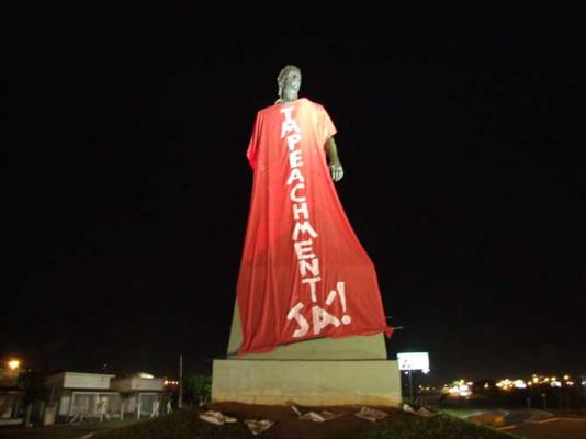 A estátua do Laçador, localizada na zona norte de Porto Alegre, amanheceu nesta sexta-feira coberta por pano com palavras contra o governo Yeda Crusius. Como se fosse um poncho vermelho de cinco metros de comprimento, o tecido estampava as frases "Impeachment já" e "Fora Yeda e Feijó". O material foi colocado às 6h e retirado 45 minutos depois por dois policiais militares.