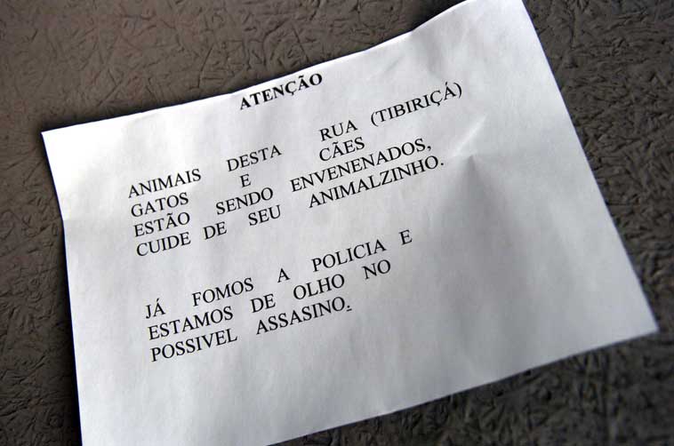 Felinos são alvo de veneno na Rua Engenheiro Antonio Carlos Tibiriçá, no bairro Jardim Botânico