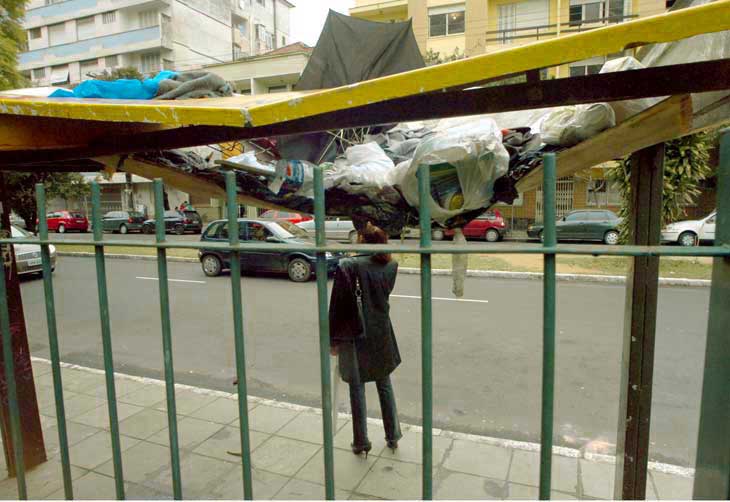 O local usado por um morador de rua para dormir à noite — uma parada de ônibus na Rua Ramiro Barcelos, próximo ao Hospital de Clínicas — ruiu e foi retirada pela EPTC. O teto, prestes a desabar, perturbava os usuários que têm de embarcar nos ônibus do bairro Bom Fim.