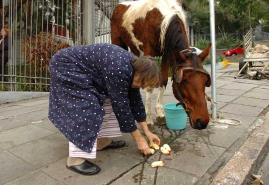 Walmy pegou água, titubeou mas acabou levando também uma banana e uma maçã para o cavalo.