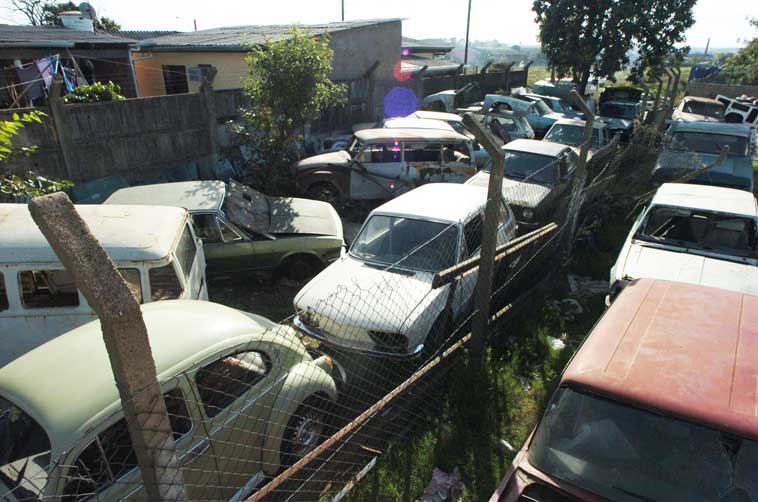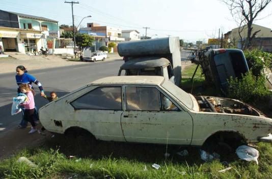 Carcaças de carros velhos, pedaços de veículos enferrujados e sem pintura se espalham por um trecho da Avenida Bernardino Silveira Pastoriza, no bairro Rubem Berta, na zona norte de Porto Alegre. A vizinhança se incomoda porque os carros ocupam a via, obrigando os pedestres a cruzarem pela rua para transitar. Enquanto isso, o dono do ferro-velho rebate: