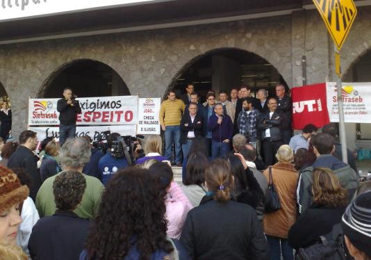 O prefeito de Blumenau, João Paulo Kleinübing, foi até a praça em frente à prefeitura na manhã desta sexta-feira para conversar com os servidores municipais, em greve há cinco dias. Ele manteve a proposta de reajuste rejeitada pelos servidores quinta-feira, em assembleia, e foi bastante vaiado pelos grevistas.