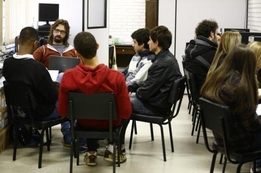 Professor Gabriel Goldmeier durante uma explanação aos alunos na aula de Seminário Integrado, no Colégio Estadual Florinda Tubino Sampaio, na Capital