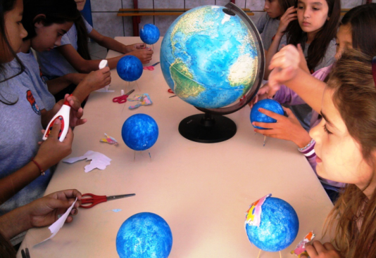 Depois de assistir a slides, que mostravam imagens do planeta cada aluno confeccionou seu globo terrestre utilizando bolinhas de isopor, com pintura e colagem. Para finalizar o projeto foi feita a visita ao Planetário da Universidade Federal de Santa Catarina, onde os alunos puderam visualizar de perto aquilo que aprenderam em sala de aula.
