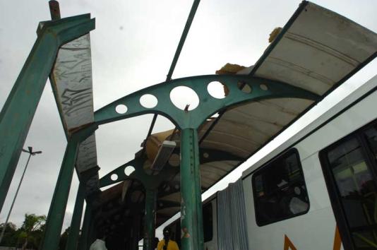 Os dias de chuva são um martírio para os usuários de ônibus que utilizam o terminal localizado no cruzamento das Avenidas Antônio de Carvalho e Ipiranga. Com vidros laterais quebrados e a cobertura parcialmente arrancada, a parada — que deveria ser um benefício para os passageiros — se torna perigosa.