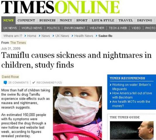 Mais da metade das crianças que tomam o remédio utilizado no combate à gripe A, o Tamiflu, sofrem efeitos colaterais como náusea e pesadelos, aponta uma pesquisa da Agência britânica de Proteção à Saúde, publicada pelo site do jornal Times.