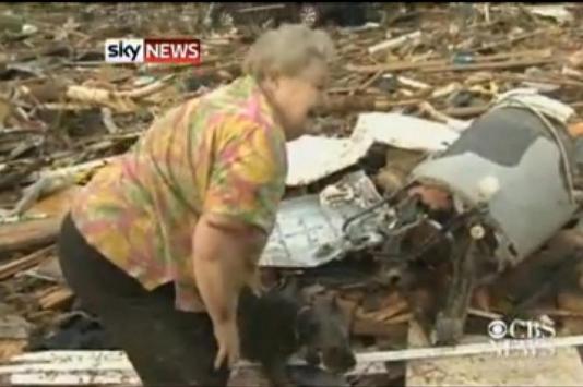 Durante uma entrevista à rede CBS, Barbara Garcia, moradora de Moore, no subúrbio de Oklahoma, encontrou seu cachorro vivo em meio aos escombros da casa devastada pela passagem de um tornado, ontem. Barbara contava que estava sentada com seu cão no colo quando o tornado atingiu a casa. Ela ficou deitada no chão e perdeu o cão de vista. Logo depois, a repórter alerta a moradora sobre o cachorro, coberto por objetos.