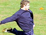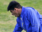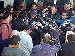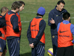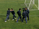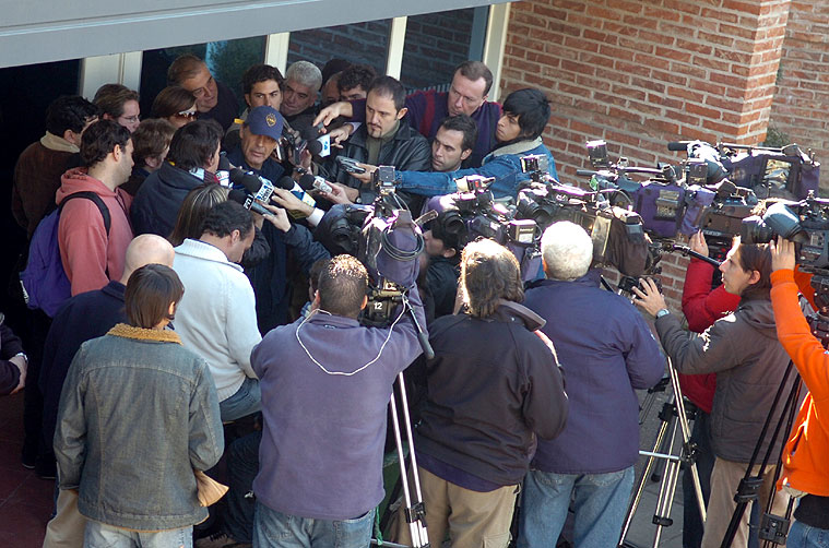 O técnico Miguel Russo (de boné) dá entrevistas ao final do treino fechado