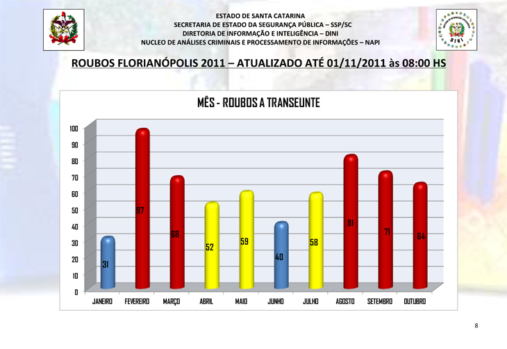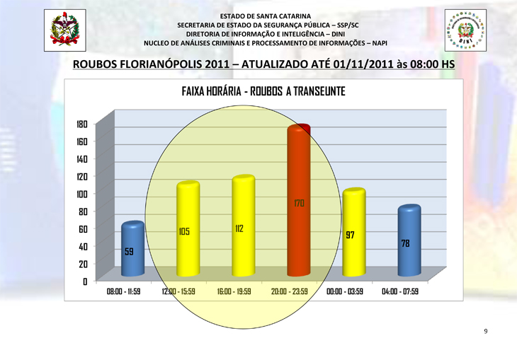 O meses com menor incidência foram janeiro e junho. O horário preferido dos assaltantes foi entre as 20h e as 23h59min. A grande maioria das ações - 38% - aconteceram no Centro da cidade. Outros bairros bem visados pelos ladrões foram Ingleses e Trindade.