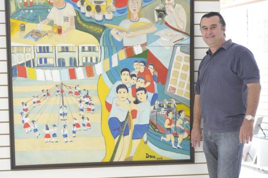A poesia de varal, a fachada antiga, as competições, a tecnologia e o conhecimento estão retratados no painel patrocinado por uma empresa de impressoras e periféricos.