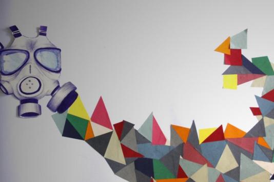 Na exposição de Mathias e Valter, colagens e cores representam esse momento: máscaras são as únicas ilustrações do projeto e representam o filtro que as pessoas precisam criar para absorver as mudanças.