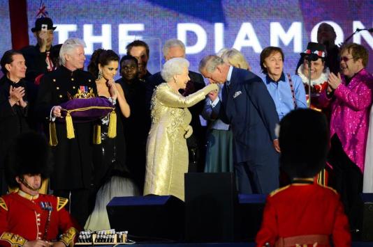 Usando um vestido dourado, Elizabeth II subiu então ao palco junto ao príncipe Charles, que a descreveu como uma pessoa "muito especial".