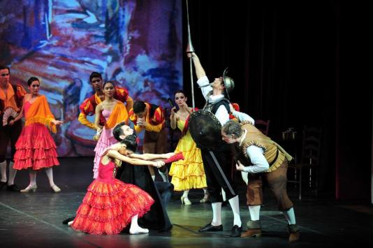 O balé Don Quixote é uma releitura da obra de Miguel de Cervantes, com a nova versão coreográfica de Vladimir Vasiliev. A história se passa na Espanha e narra o romance da jovem Kitri e do pobre barbeiro Basílio, que enganam o insolente e rico Gamach, noivo da heroína, com quem Lorenzo, seu pai, a força se casar. Com a ajuda do cavalheiro Don Quixote e de Sancho Panza, seu fiel escudeiro, os apaixonados Kitri e Basílio se casam numa grande festa em Barcelona.