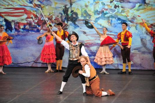 No Don Quixote, há dançarinos da Cia. e alunos de diversas séries. O coreográfo russo Vladimir Vasiliev é o responsável pela versão que será apresentada hoje. Ele se inspirou no trabalho de um aluno de Petipa, em 1900, Alexander Gorsky, também para o Bolshoi. Gorsky criou um Don Quixote alegre e democrático, com um espírito de improvisação que dá originalidade às cenas de multidão. O balé termina com o casamento de Kitri e Basílio em Barcelona.