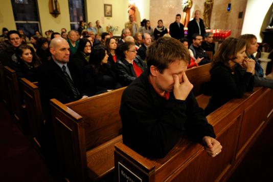 Pessoas de luto rezam dentro da St. Rose of Lima Roman Catholic Church na vigília pelas vítimas