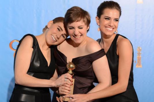 Lena Dunham (ao centro) comemora prêmios com as colegas de elenco Zosia Mamet e Allison Williams