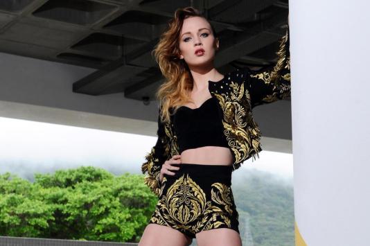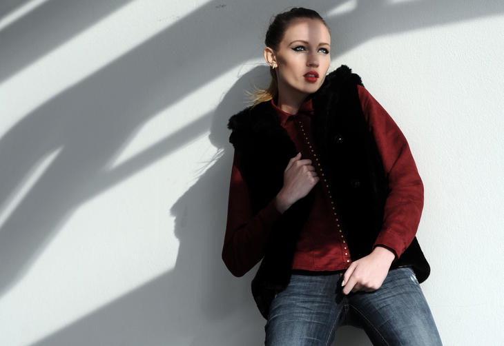 A catarinense Damyller combinou bordô com preto, criando um clima gótico ao inverno. O jeans lavado tem detalhes de crucifixos nos bolsos dos quadris. A camisa com tachas usada fechadinha dá um ar boyfriend à produção, arrematada com o colete de pele fake — material que dominou as coleções de inverno 2014 nos desfiles das semanas de moda internacionais (principalmente Milão e Londres).