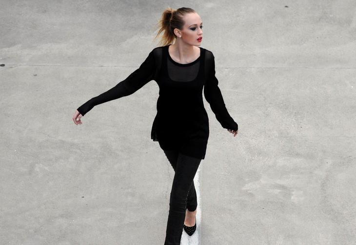 A John John vai de tricô delicado e quase transparente. O shape dark domina a coleção, pincelado com tecidos de efeito metalizado, principalmente nas calças coladas ao corpo. O scarpin com tachinhas é o toque de elegância da produção.