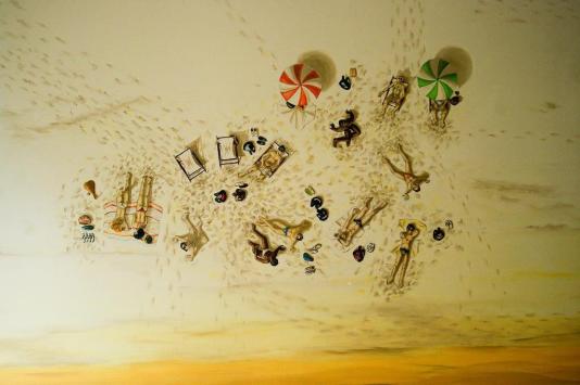 O artista suprime o enquadramento recorrente, retirando a linha do horizonte e eliminando a representação sob olhar tradicional. Nas imagens, a predominância de ocre e matizes enfatiza o clima costeiro e contemplativo das figuras retratadas em óleo sobre tela. A sensação de areia, preguiça e relaxamento é contagiante, não temos como visitar a exposição e não sair mais relaxados.