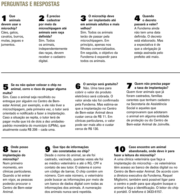 A elaboração está em fase final pela Fundação Municipal do Meio Ambiente (Fundema), e vai obrigar que todos os animais, filhotes, adultos, de raça ou sem, sejam identificados eletronicamente com a implantação do microchip – que tem o tamanho de um grão de arroz. Confira no quadro abaixo algumas perguntas e respostas sobre o tema e entenda como serão os processos para a implantação do microchip.