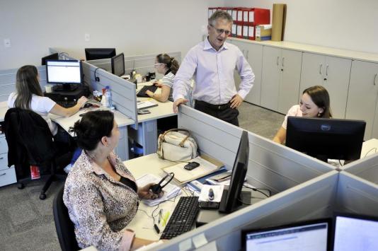 O executivo da Linx Celio Valcanaia decide quais palestras vão ser assistidas pela equipe em uma reunião com todo o time